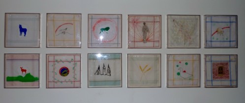 per questa tua rentrée sul vivo dell’arte contemporanea ti offro per l’esposizione questa serie di opere: I “fazzoletti”, sorta di ministendardi protetti da una teca in plexiglass, leggermente dipinti o con minimi collage a evidenziare la fragilità e precarietà della natura e dell’uomo applicati su geometrie tessili trovate e abbinate a figure, tratti liberi e simboli istintivi. Figure e segni che ritroviamo nella serie del racconto/diario con le tempere di piccole dimensioni che dal 2000 accompagnano l’evolversi del mio lavoro. Un racconto che parla per immagini e abbina lo stato d’animo quotidiano con gli elementi della geometria e attraversando l’antico e contemporaneo in un gioco temporale e simbolico. Qui ne vediamo 12 delle circa 120 realizzate ad oggi.